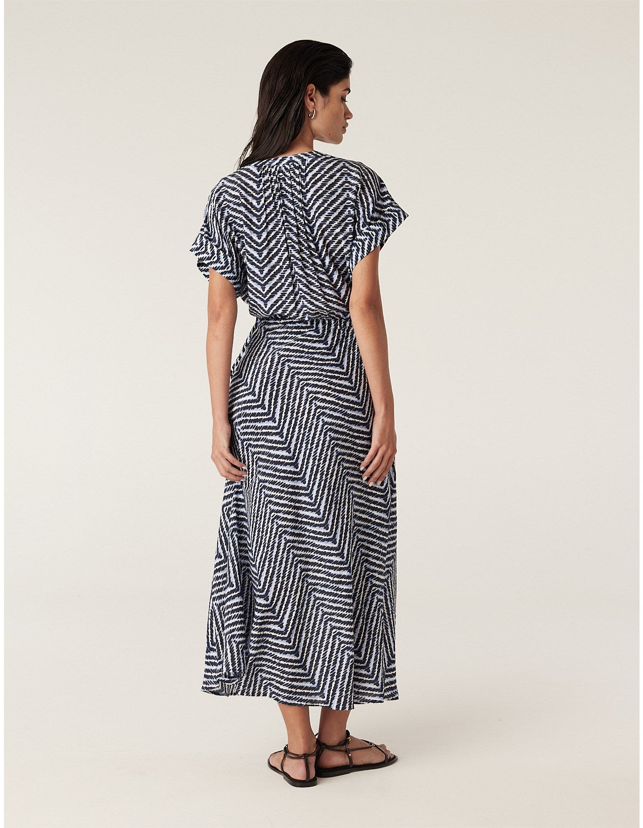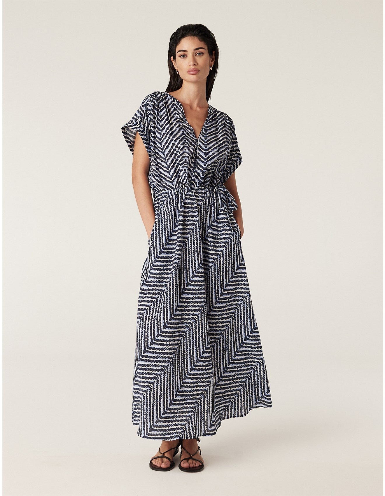 The Cable Sea Breeze Dress offers a relaxed fit with an adjustable side tie to define the waist. It features a V-neckline with a narrow stand collar and a bias-cut skirt with side pockets.