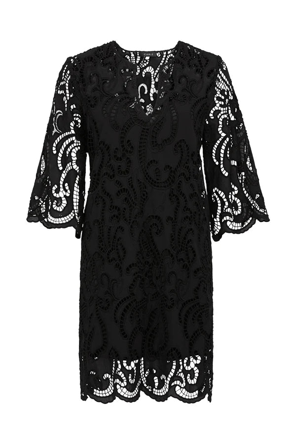 The Shadow Embroidered Dress is a relaxed fit style made from 100% cotton broderie with scalloped hems. It features a V-neckline and comes with a detachable stretch slip for comfort and coverage.