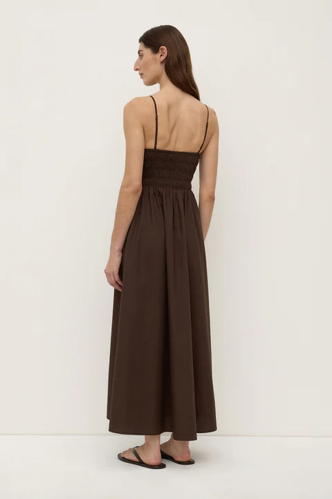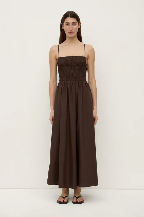 The Aubrey Ruched Dress in ganache is a 100% cotton dress with a ruched fitted bodice and full skirt.