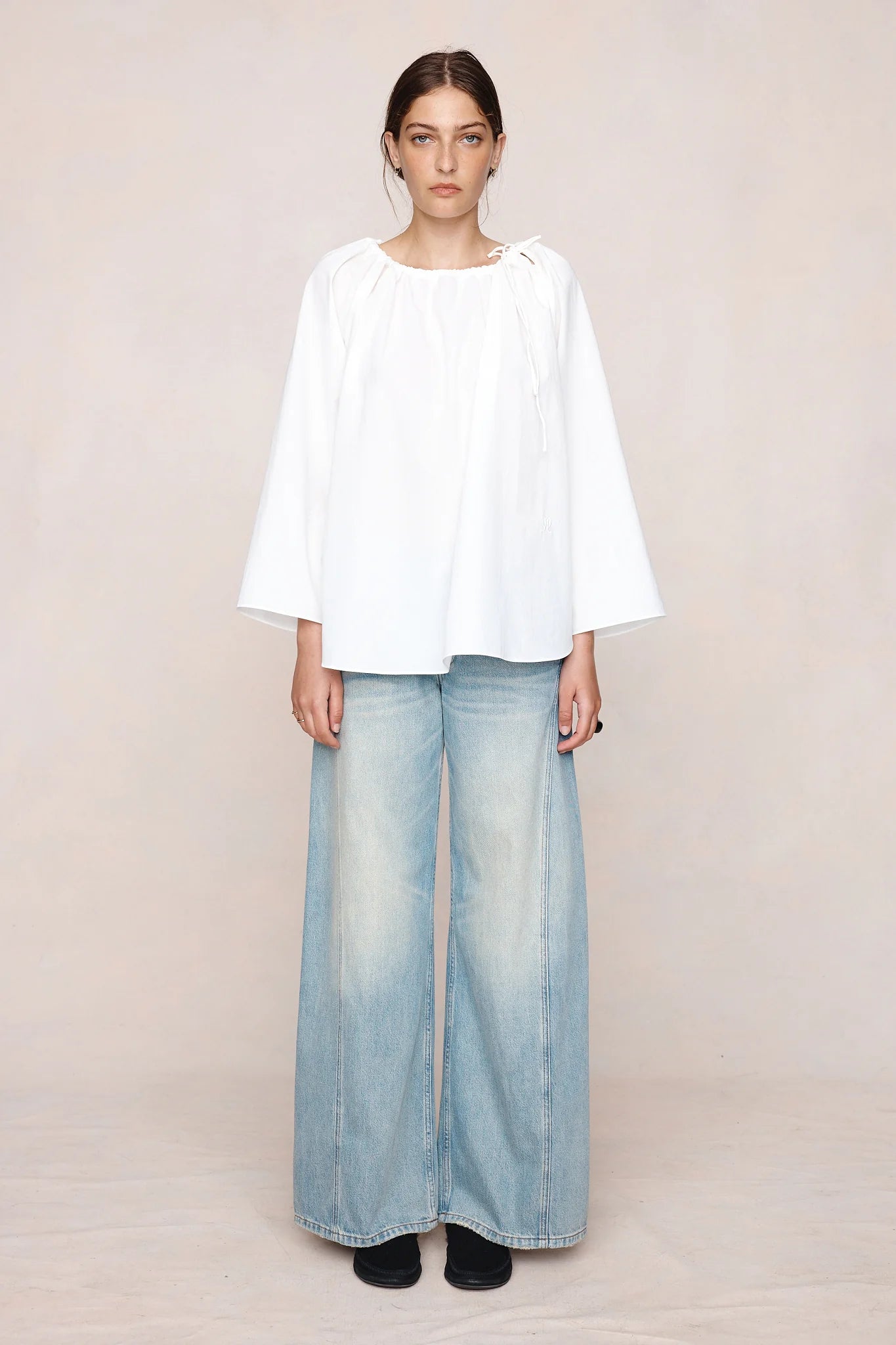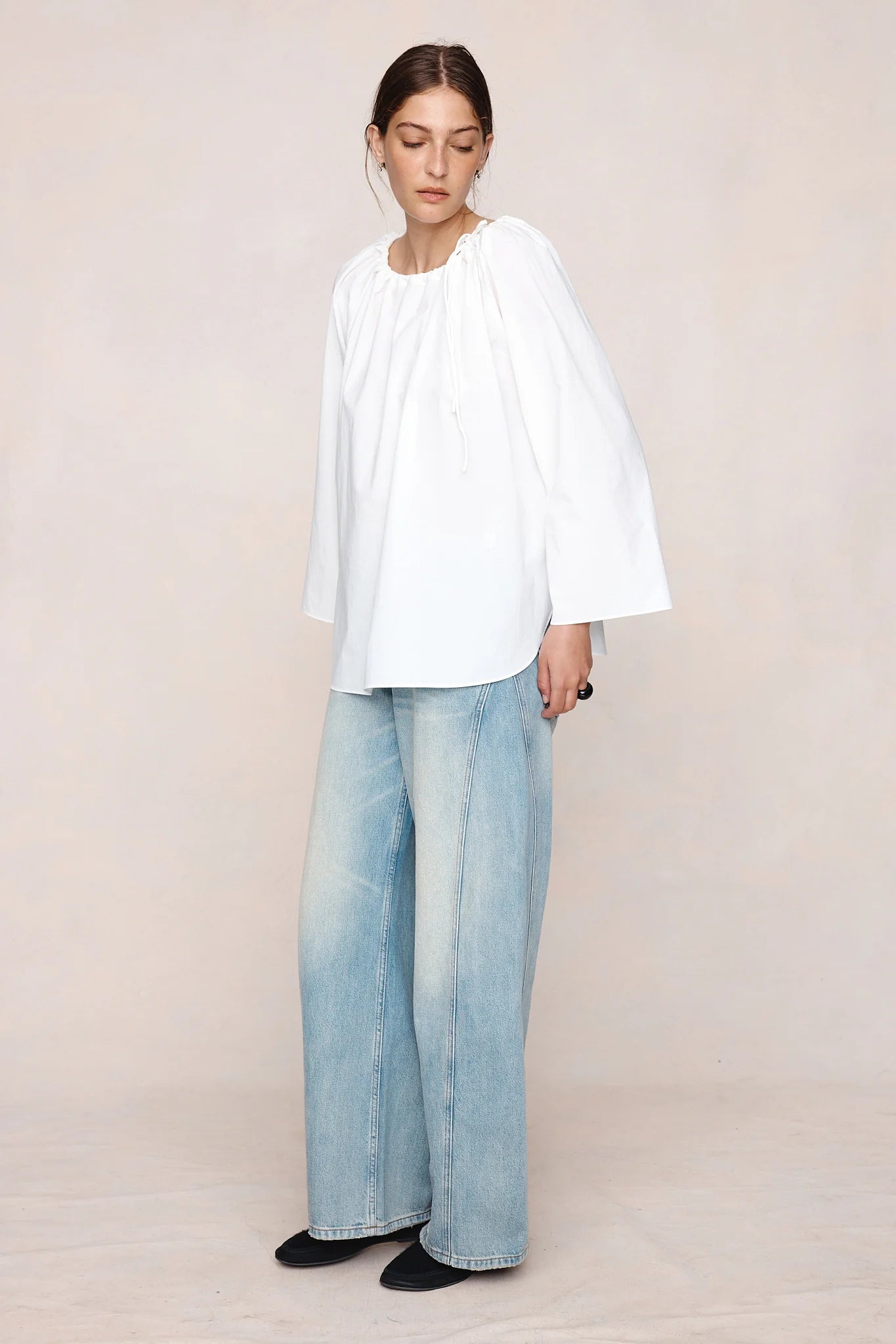 Voluminous top with a gathered neckline, adjustable tie detail, full wide sleeves, subtle gathers through the front and back, and a curved hem.