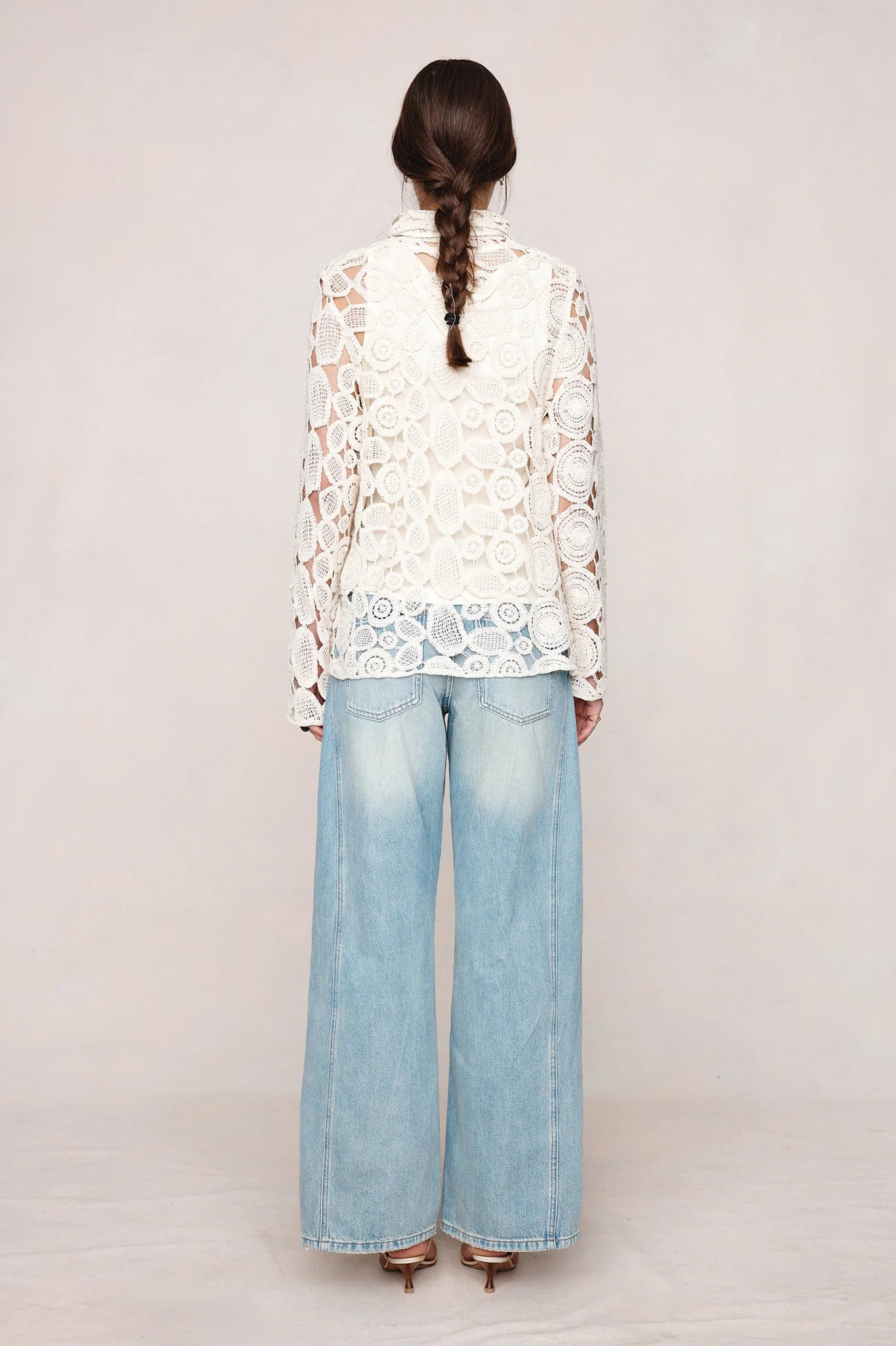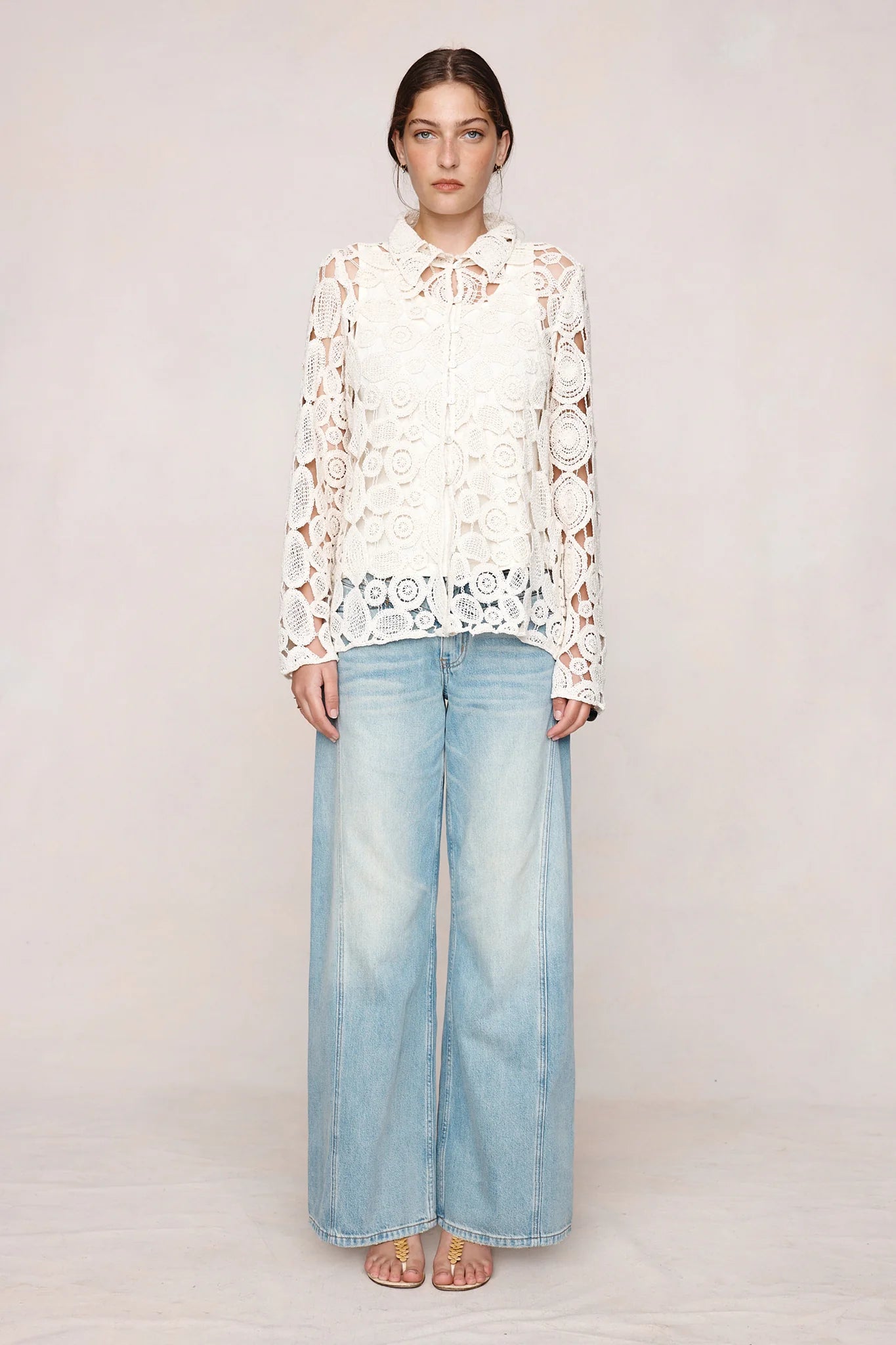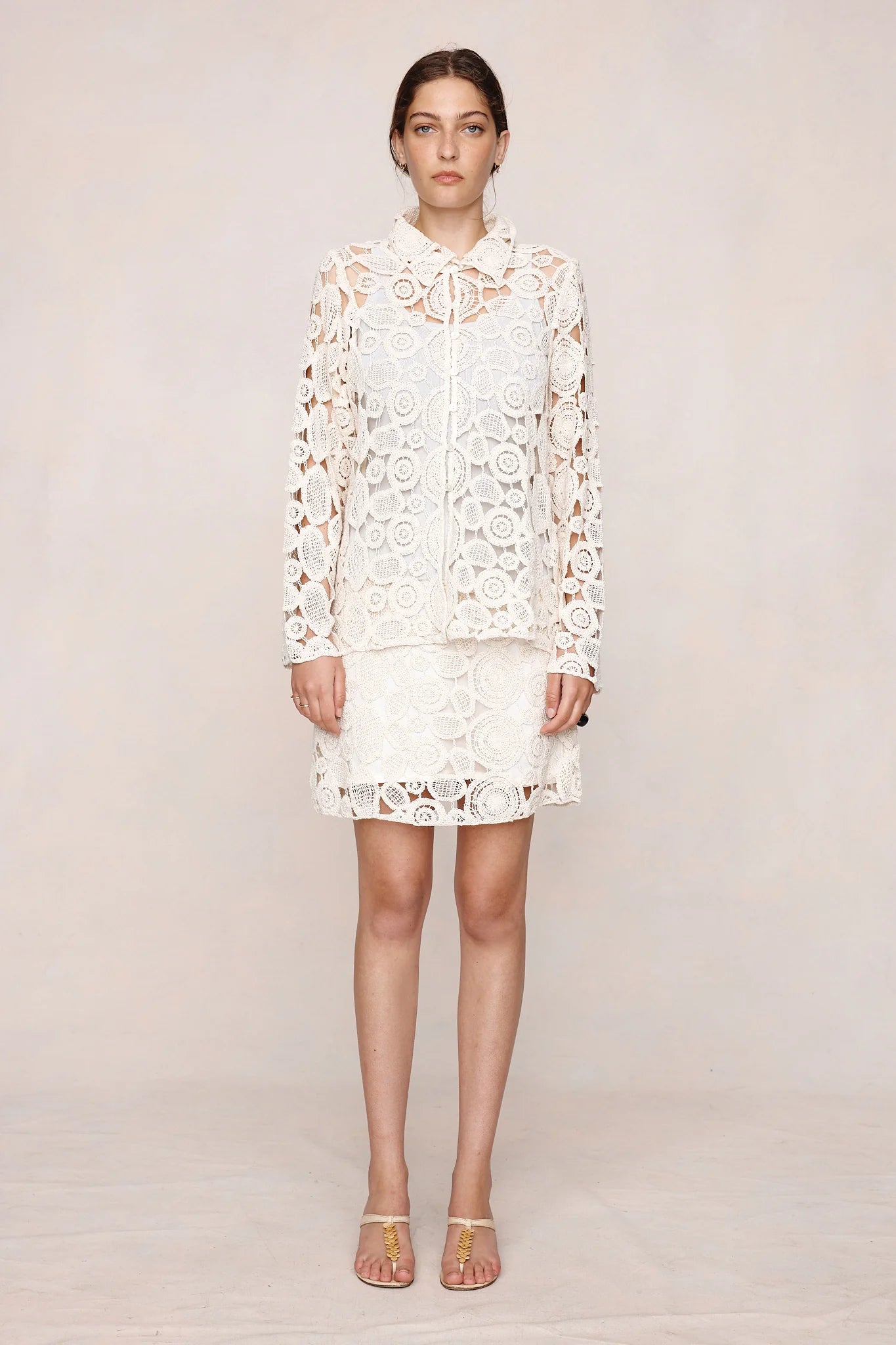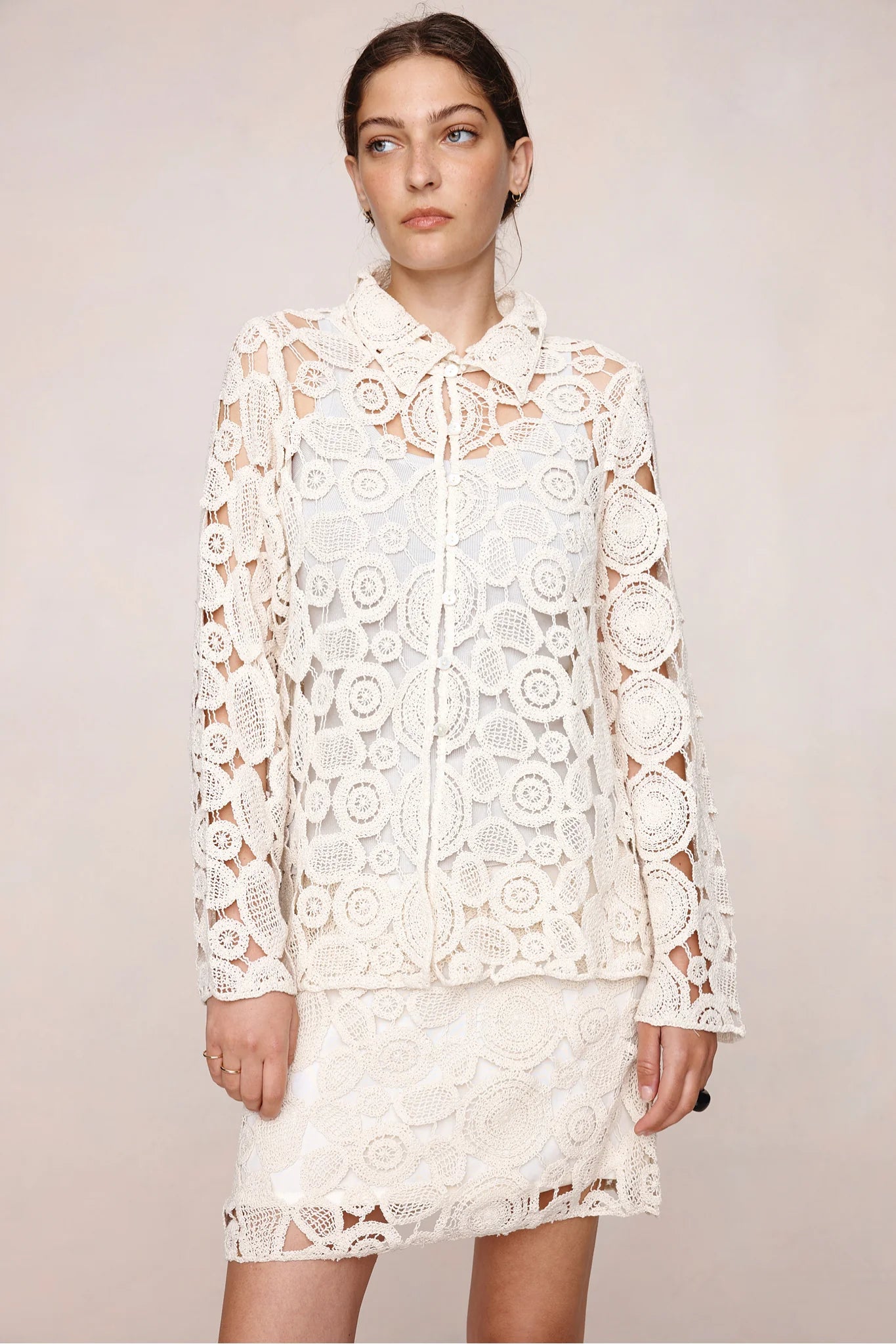 The Pierre top in 100% cotton circular-motif crochet lace with a relaxed, slightly boxy fit, pointed collar, button-through front, full-length sleeves, and an unlined construction.