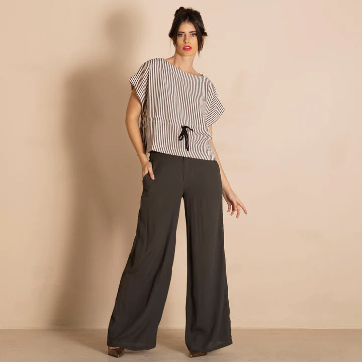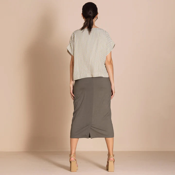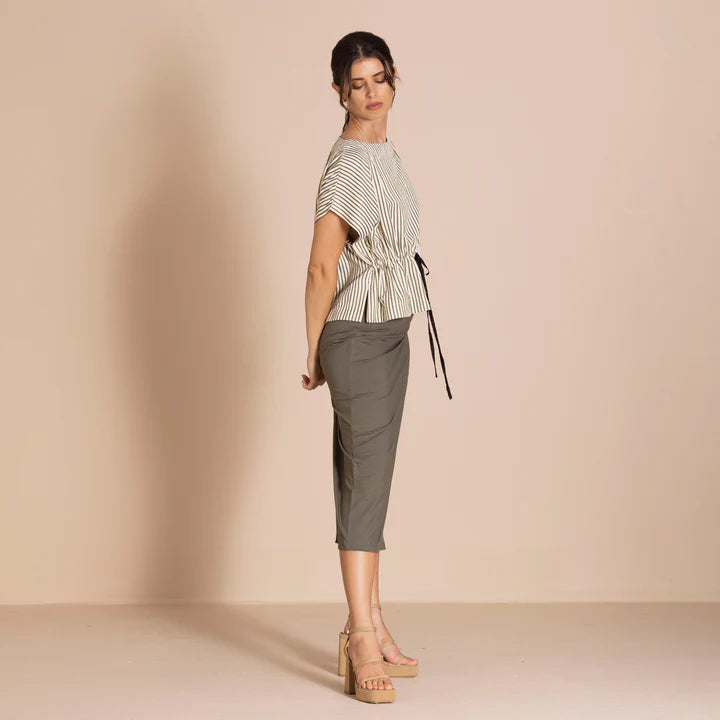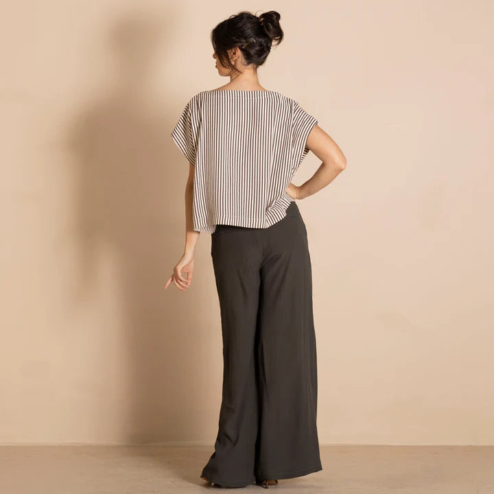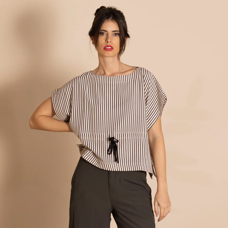 Sitting at hip length, the candy stripe tableau top is a lovely, box cut, light weight top with boat neck line, and splits on the sides for ease of fit. Featuring a front-only drawstring to adjust to the shape you like without affecting the lovely clean back.