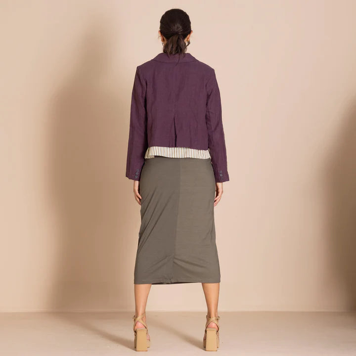 The birdie jacket can be worn open or fastened with hand-dyed coconut shell buttons. A subtle pleat at the mid-back adds a touch of flair, enhancing its slight A-line silhouette with a gentle kick. Finished beautifully with french seams.