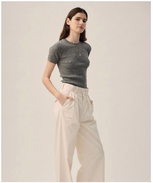The Marle Athena Pant in Milk is a structured wide leg full length trouser made from a heavy weight cotton. Designed with a tailored aesthetic, these pants feature a flat waistband, front pleats, pockets, and a zip fly with a hidden hook closure. They offer a refined, minimalist look in a versatile, soft white hue