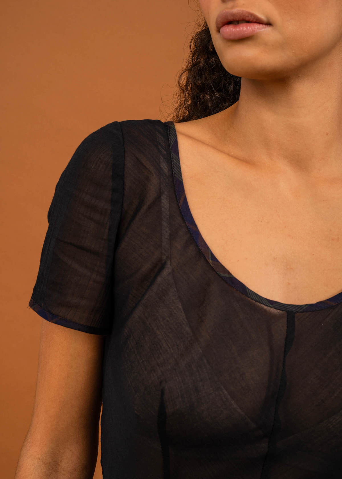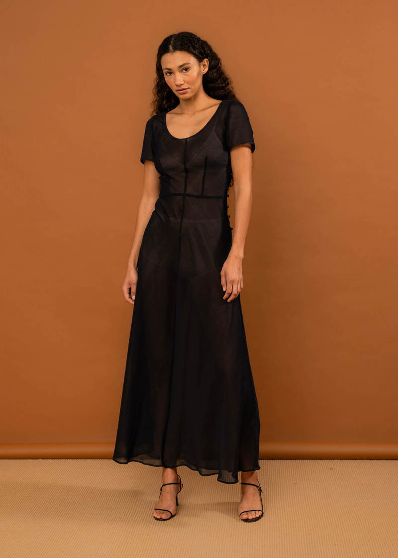 Bias cut dress in a semi-sheer cotton crepe. Features short sleeves and a wide scoop neckline which are finished with contrast binding. The bodice is shaped with front darts, leading into a fitted waist and a long bias skirt and carefully finished internally with French and bound seams. The dress fastens at the side with covered buttons.