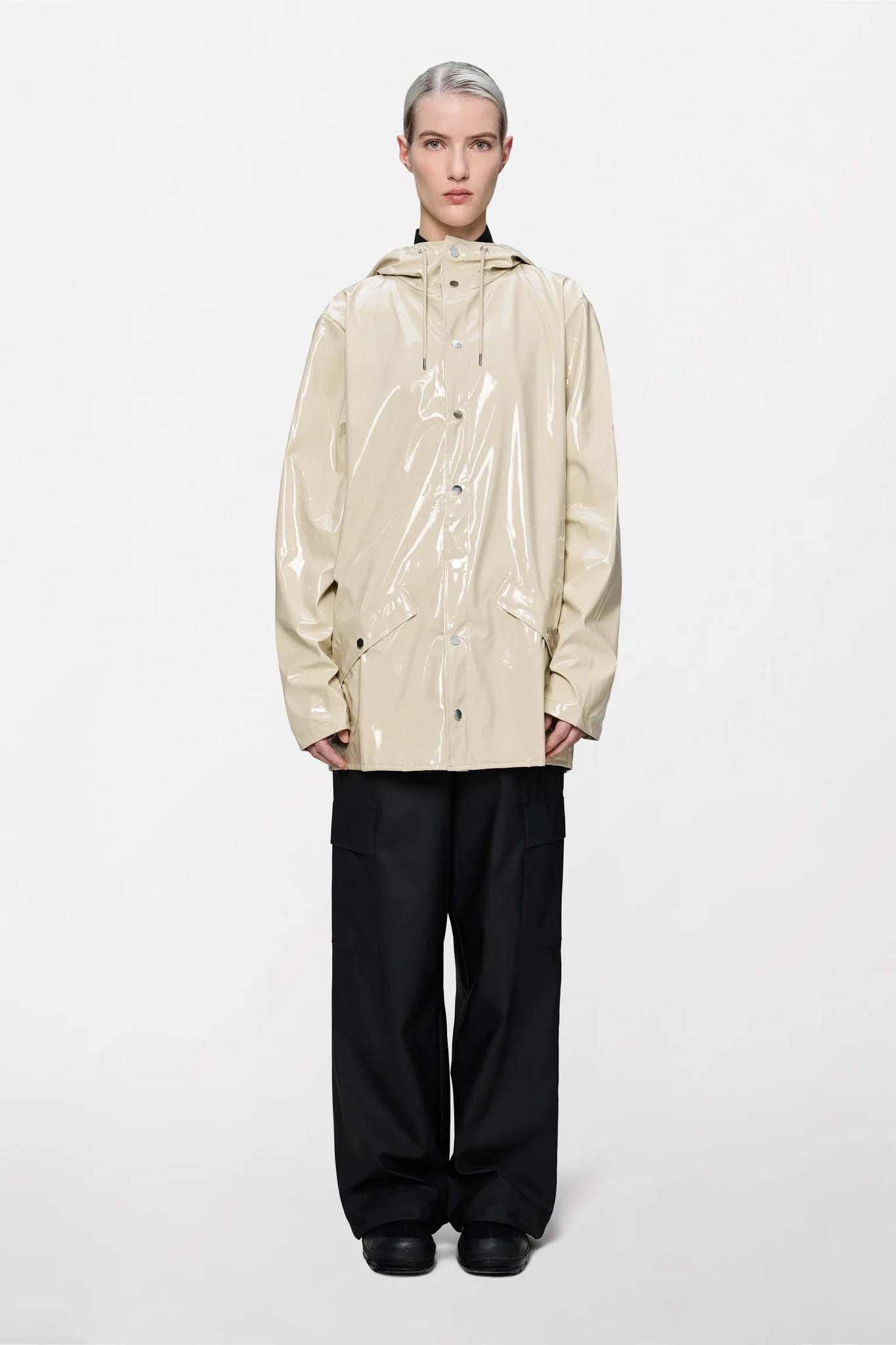 Jacket is cut from Rains' signature PU fabric and features welded seams. The finish is lightweight with a smooth feel.