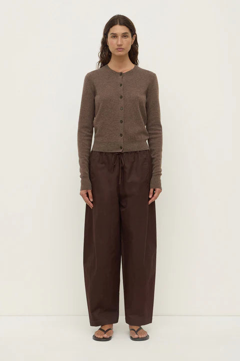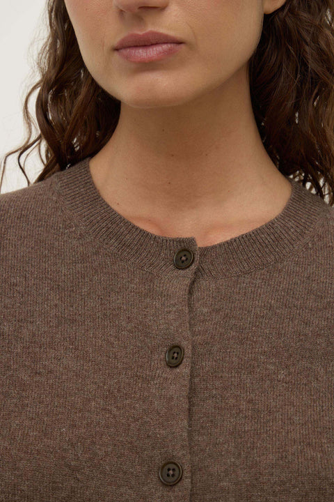 The Benny Knit Cardigan in cocoa marle is a wool blend knit cardigan with a slightly cropped length and crew neck.