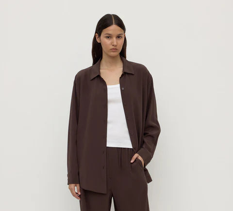 The Betty Silk Long Sleeve Shirt in ganache is a 100% lightweight silk shirt with a curved hem, internal French seams and a two-piece collar.