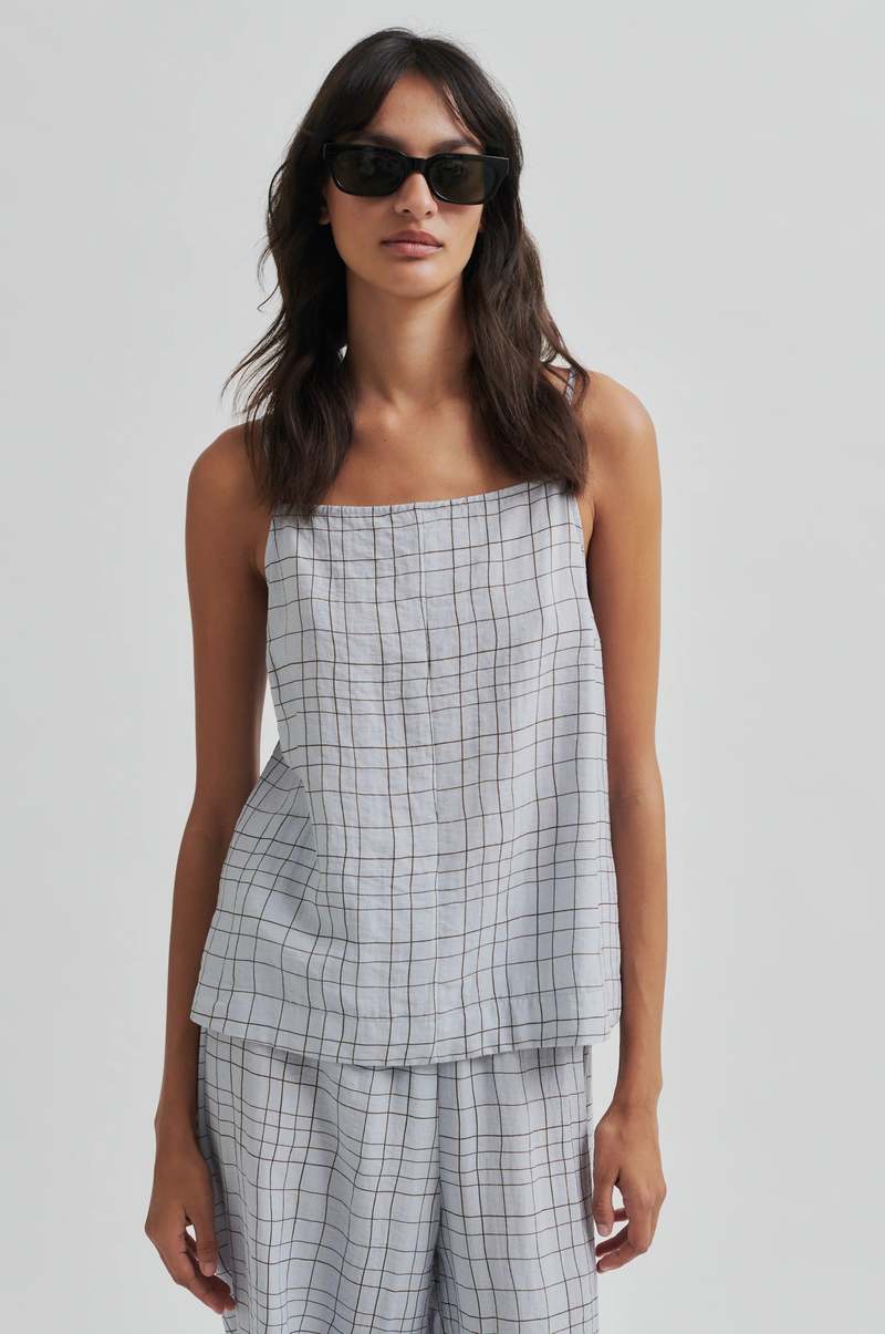 Cut from a light viscose-linen blend, Chakie is made in an allover check pattern with thin, adjustable straps and an elasticated back-piece with cut-out detail. Designed to hit at the hip, pair it with the matching Chakie pants for a coordinated set.