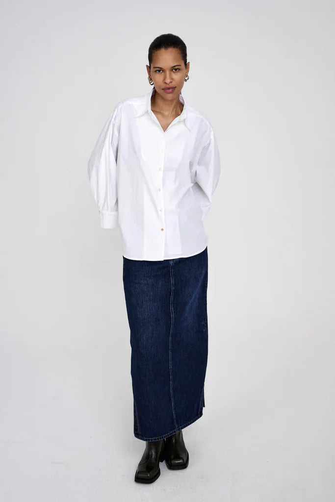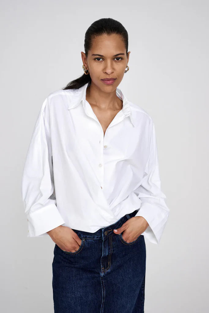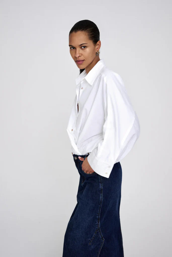 The Rabens Saloner Chloe Shirt in white is a crisp poplin cotton white shirt with 3/4 sleeves with cuffs. Known for its light, breathable feel, this versatile piece fits true to size and embodies the brand's Scandinavian, understated luxury aesthetic