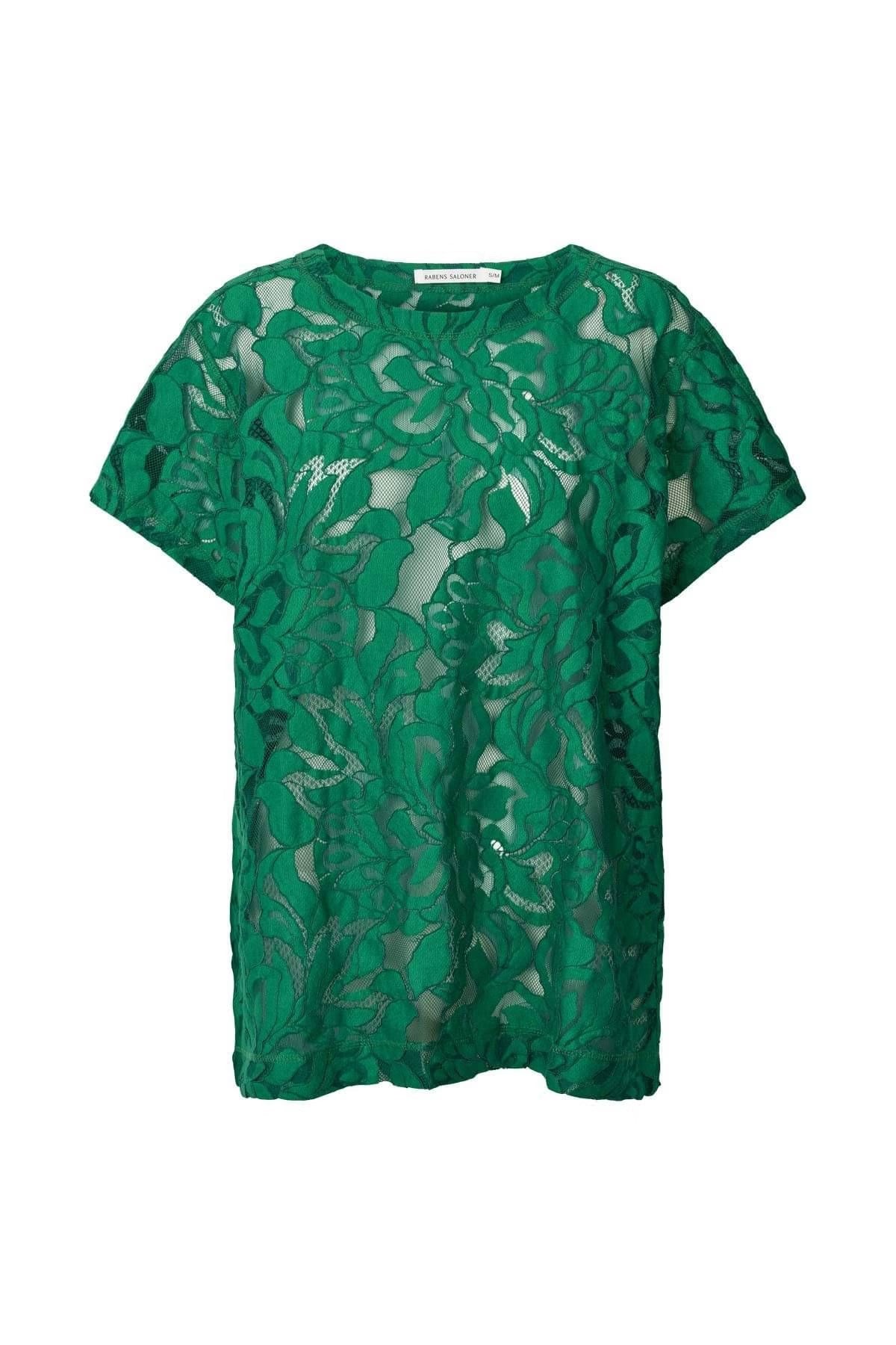 The Rabens Saloner Enia Top is a sophisticated t.shirt design crafted from delicate lace, it can be worn day or evening. It offers a relaxed, oversized fit, designed to be true to size while providing an elegant, versatile look suitable for pairing with jeans or matching skirts. The beautiful verdant green brings an exciting coloured piece to your outfit!