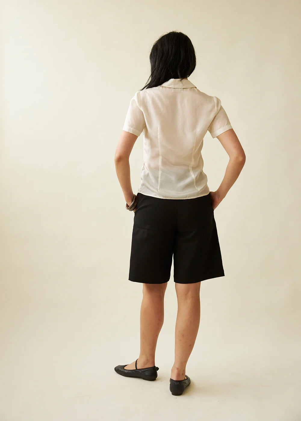 Short-sleeved fitted shirt crafted in a luxurious soft silk habotai. Features a standing collar, bust and waist darts, and fastens through the front with small shell buttons.