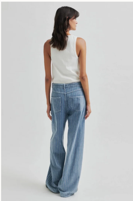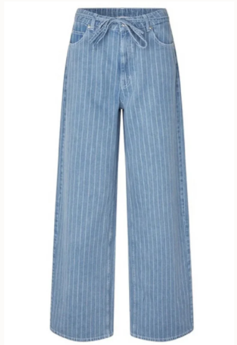 Light blue denim pants from Second Female with vertical stripes. The pants have a combination of tie, zipper and button closure, and a regular fit with floor length.