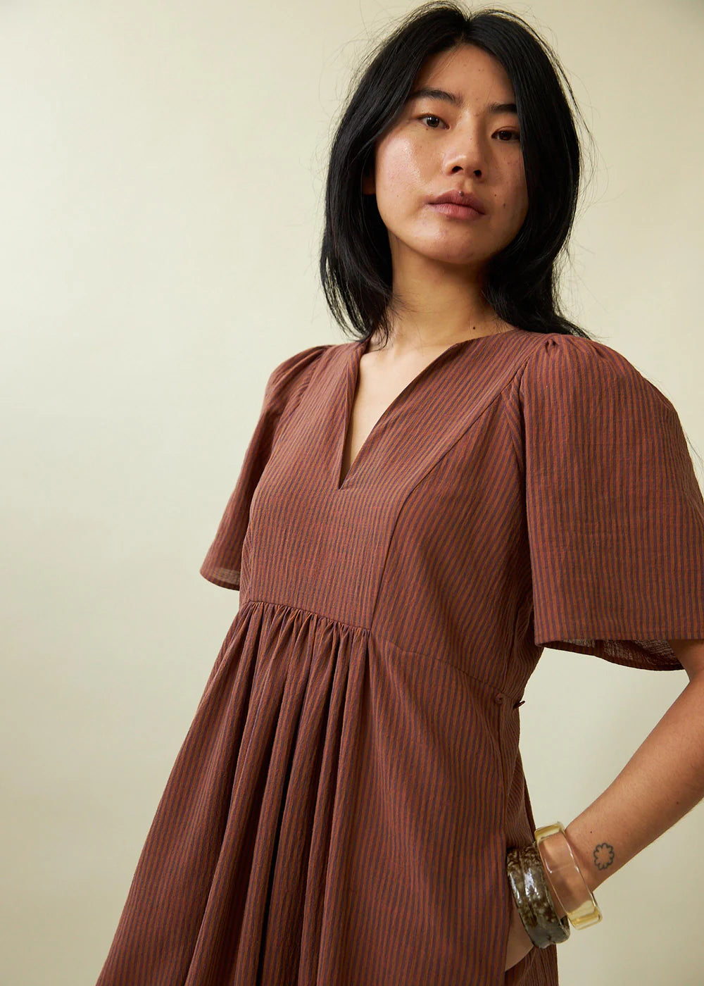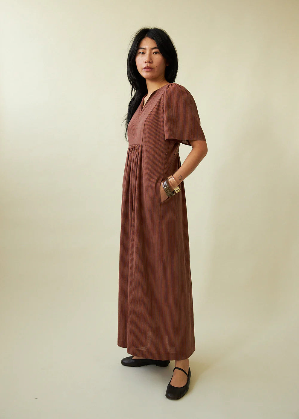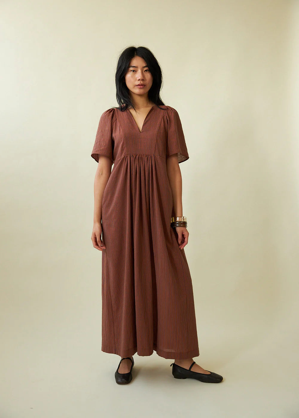 A Limited edition long dress in a Japanese cotton crepe with a fig and cinnamon stripe. The front yoke is fully lined and features a deep split neckline. Gathers at the front and back waist, and top of sleeve. Adjustable side waist with loop and button.