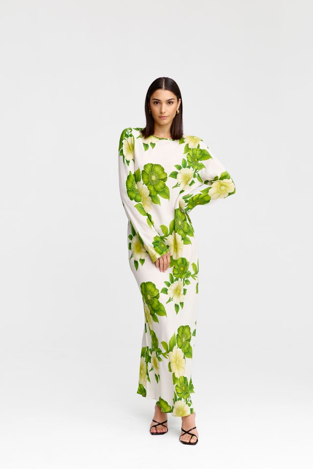 The Nadia Dress is an elegant bias-cut maxi dress, featuring a high-scoop neckline and long sleeves.