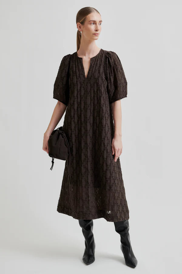 Second Female short-sleeved burnout dress. The dress is made in a viscose blend with structured pattern with semi-sheer burnout effect. Featuring a V-neckline and square shoulder seams with short puffed sleeves. Detachable slip with adjustable straps. Slim fit at the top with A-line silhouette.