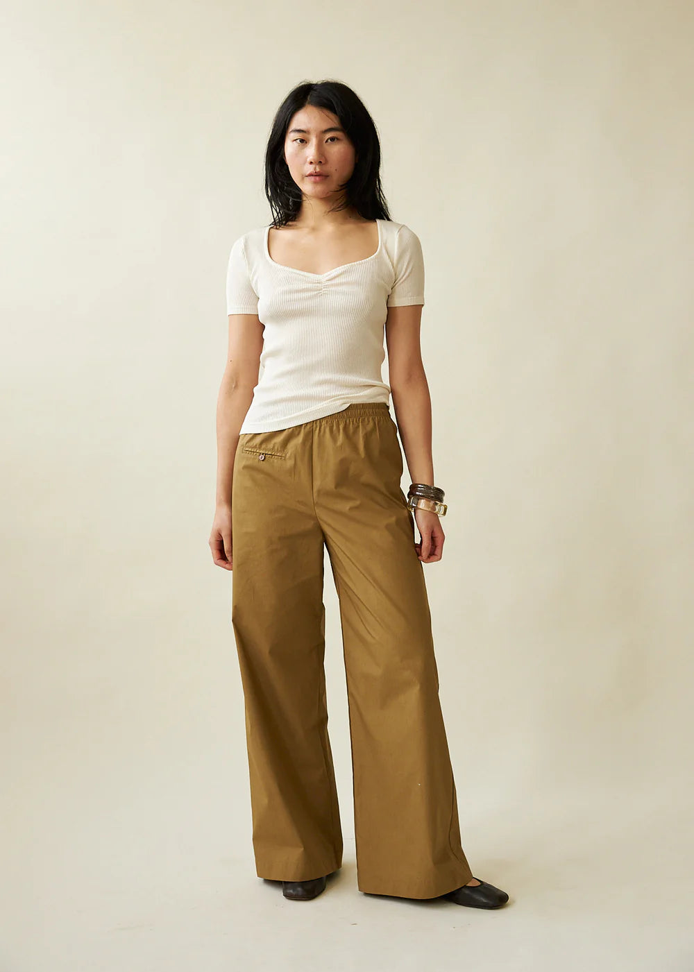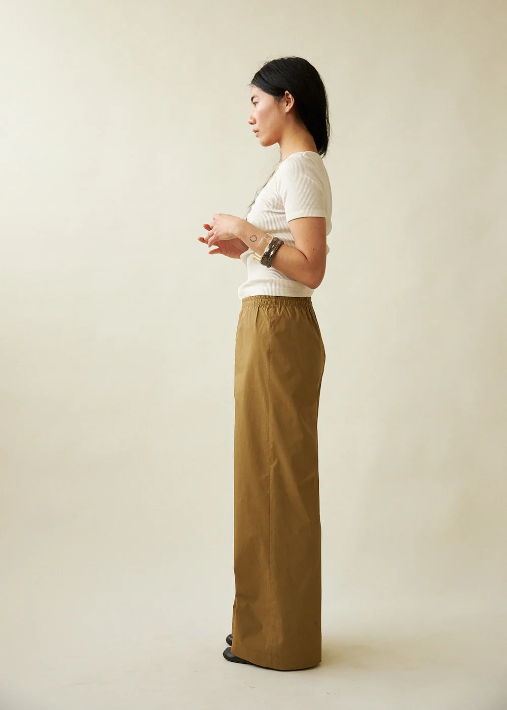 Relaxed wide-leg trouser with elastic waistband and single front jet pocket. Crafted in a fenugreek cotton paper poplin.