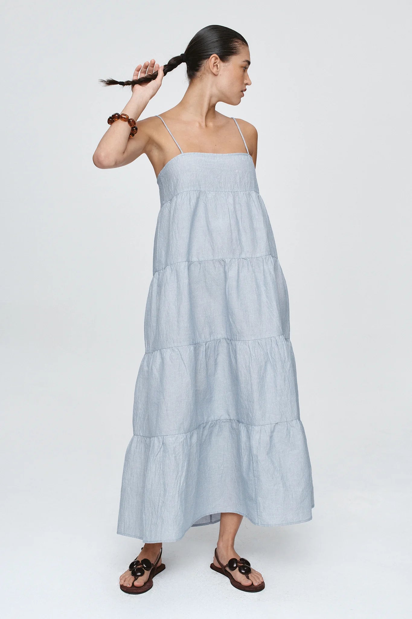 A refined take on voluminous summer dressing, the Ophelia Dress is crafted from a crisp linen-cotton. Cut with a softly tiered panel construction to create gentle volume and a fluid drape that skims the body. Subtle lining through the chest for coverage and comfort. Featuring narrow self-fabric straps that can be adjusted at the back.
