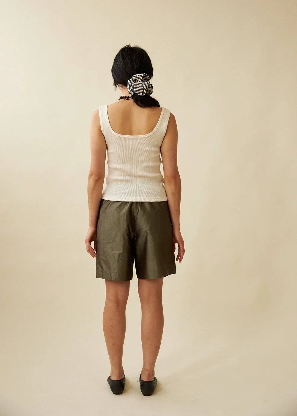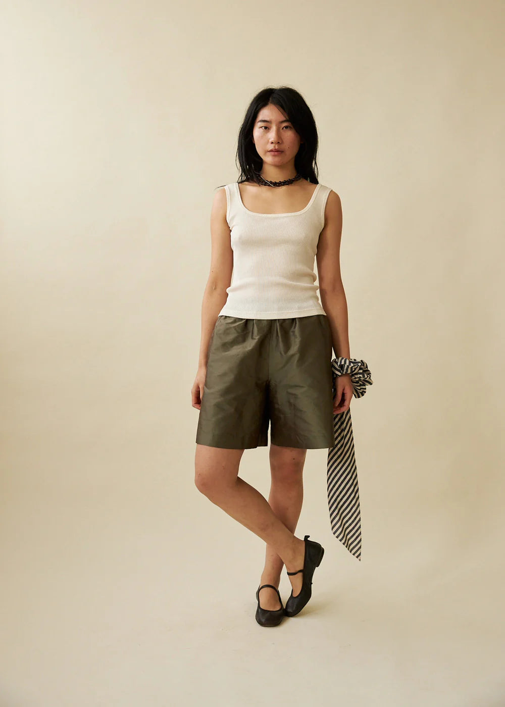 Fitted singlet crafted in a silk cotton rib knit in classic cream. Features a square neckline at the front and back. Finished with ribbed binding at the neck and armholes. Fitted silhouette finishes at the hip.