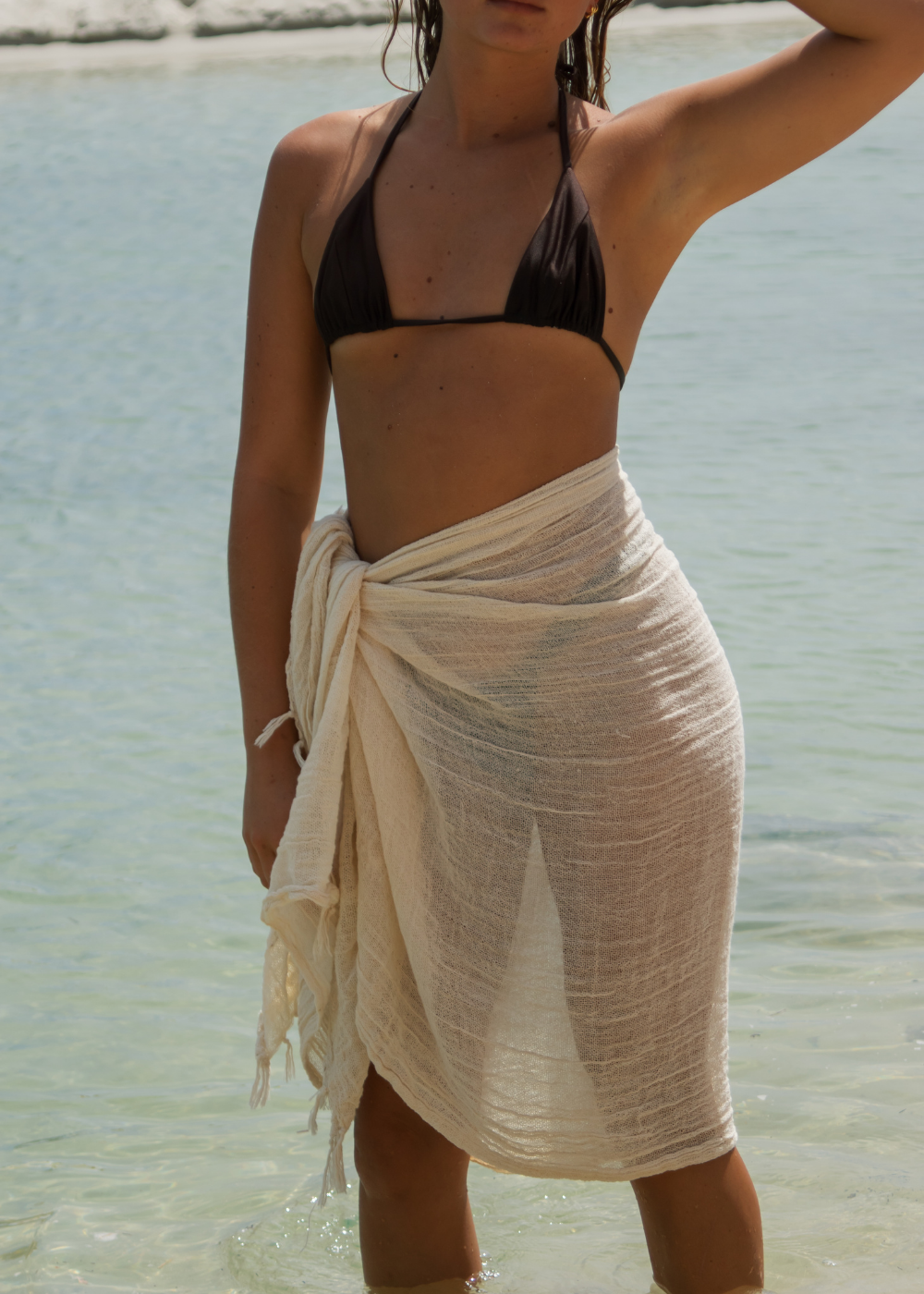 The Solstice Pareo is handwoven in Indonesia from lightweight cotton, offering a soft, breathable layer for warm days. Its sheer weave and fringed edges add a relaxed feel - perfect to tie around the waist or drape over the shoulders from beach to sunset.