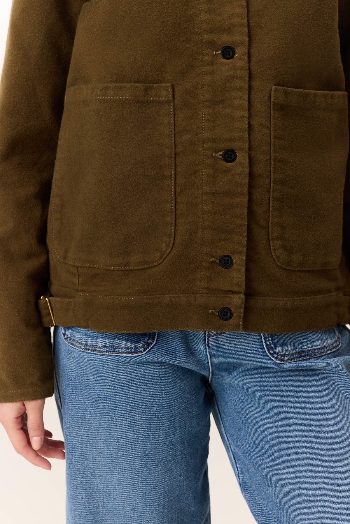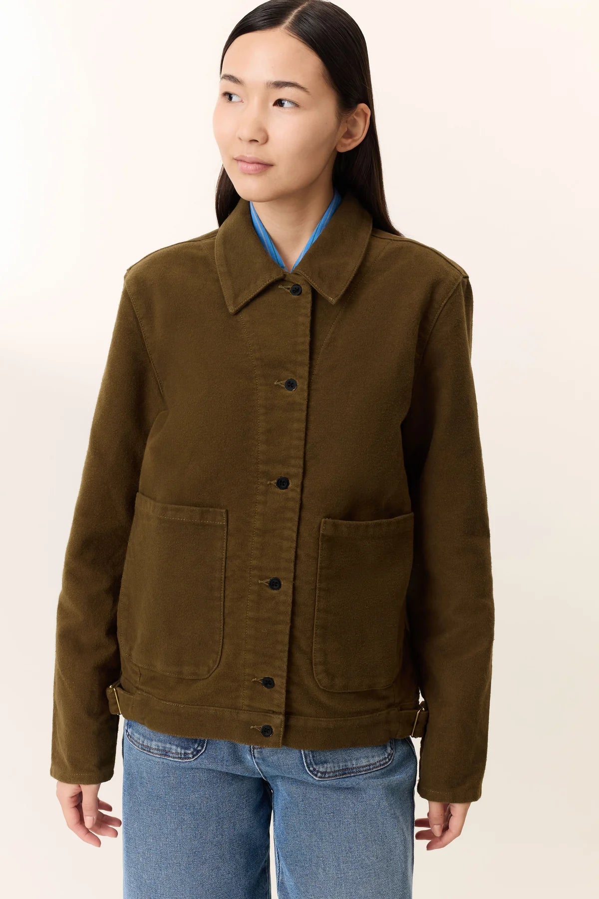 The Vanora PLN jacket offers a modern take on utilitarian wardrobe staples, featuring a straight cut that shapes the silhouette and sharp finishing touches. Its classic collar pairs with a buttoned closure, highlighted by gold buttons chosen for their character. Two flap pockets on the chest and adjustable tabs at the waist, enhanced with gold buckles, reinforce the functional aspect while asserting a distinctive style. Designed to accompany your daily life, this jacket embraces an urban look to be paired with jeans.