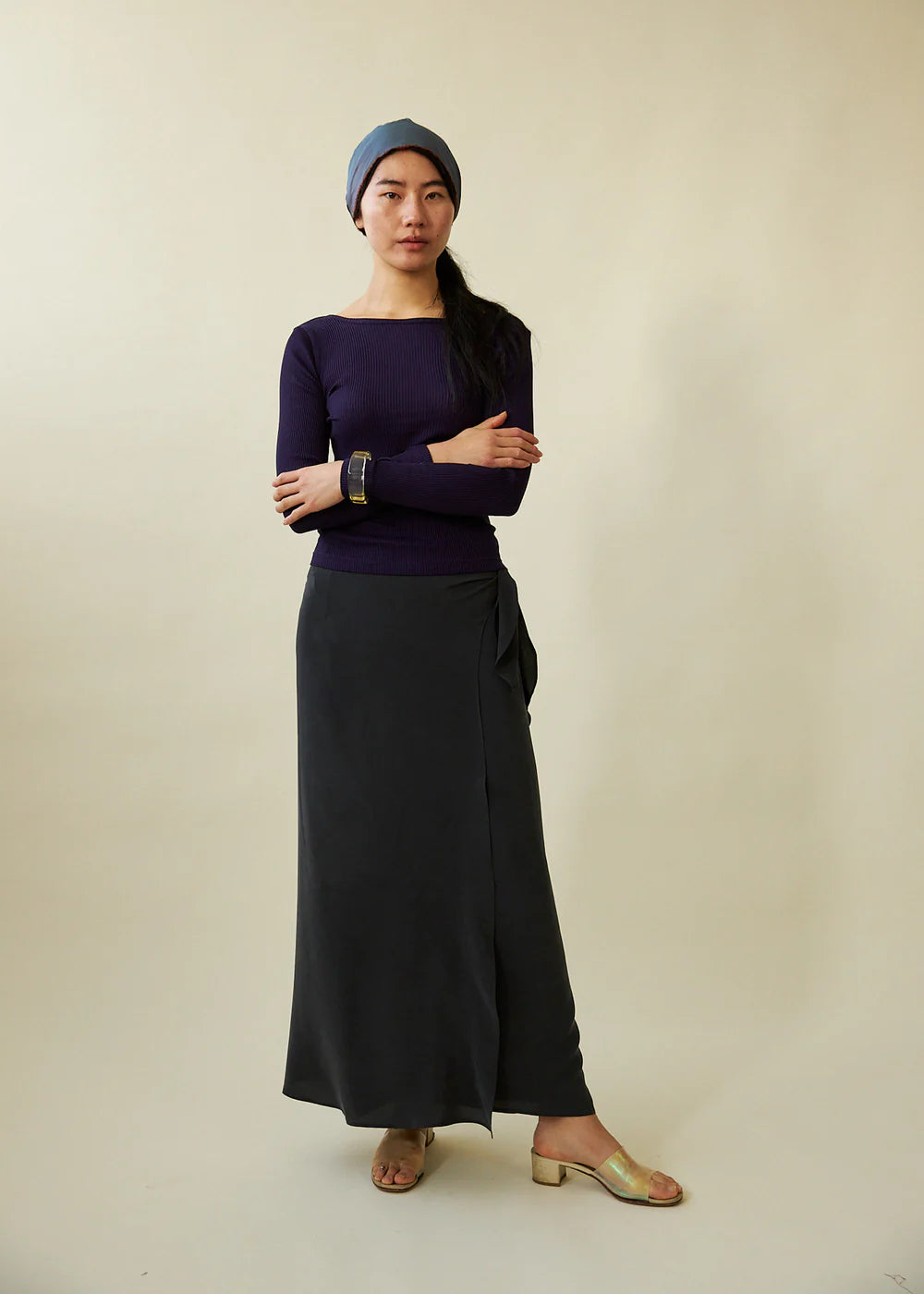 Long-sleeved top with a wide boat neckline and a rounded scoop, designed to be worn either way. Fitted silhouette finishing just below the hip. Crafted in a Japanese silk cotton rib in rich violet with blue undertones.