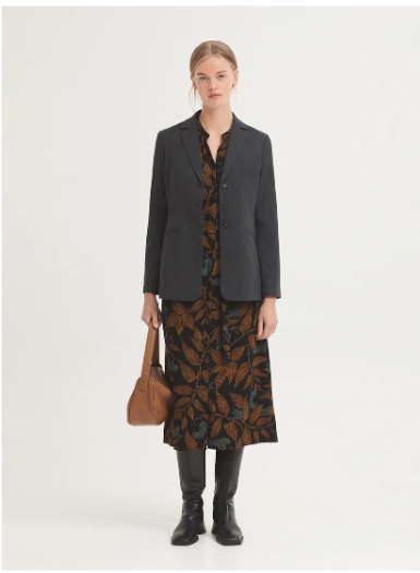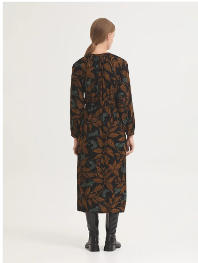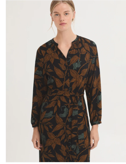 Dress in viscose crêpe fabric with Jungle print. Open Mao collar and button front. Raglan sleeves with vent, cuff and button. Flared fit. Belt in the same fabric.