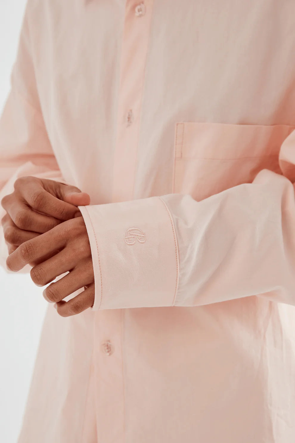 An oversized shirt in a crisp baby pink cotton. Designed with a relaxed, androgynous fit that pairs seamlessly with tailoring or denim. A playful seasonal essential with everyday ease, finished with CPD emblem embroidery on the cuff. Wear as a dress with sneakers or sandals/shoes.